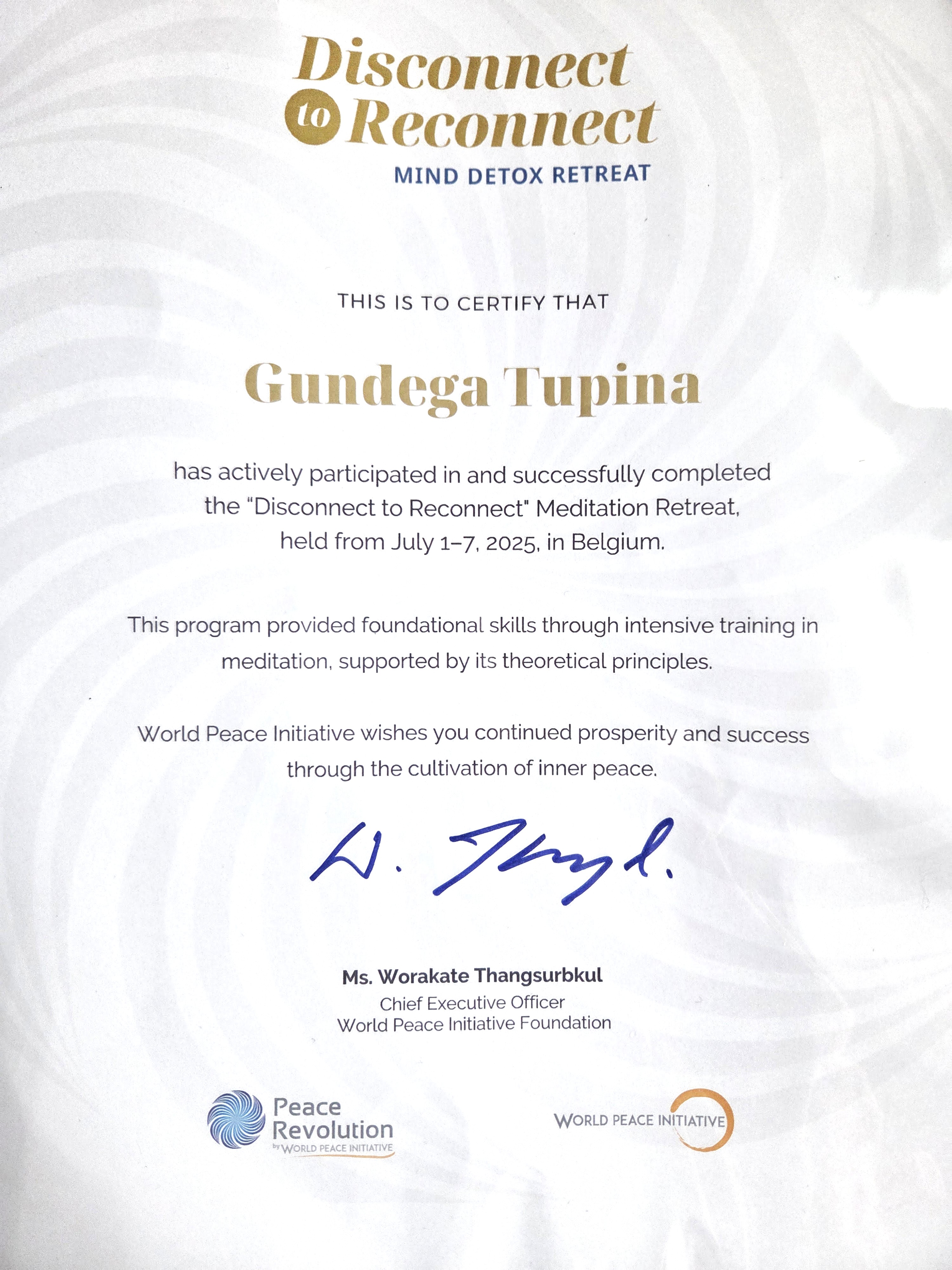 - July 2025 – Meditation retreat “Disconnect to Reconnect” from World Peace Initiative (Lede, Belgium), 7 days