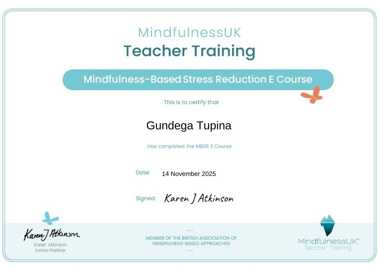 - November 2025 – MBSR course online (8 weeks), “Mindfulness UK”